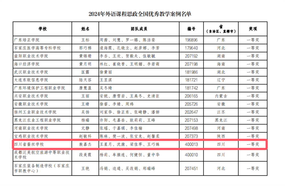 经过专家组的严格评审和复核,我校英语教师团队最终荣获2024年四川省外语课程思政教学比赛一等奖,并获得推荐参加国赛的资格,在随后公布的2024年外语课程思政全国优秀教学案例名单中,敖嘉杰团队荣获全国一等奖,再次证明了我校的教学水平和课程思政实践能力得到了全国范围内的认可和肯定。