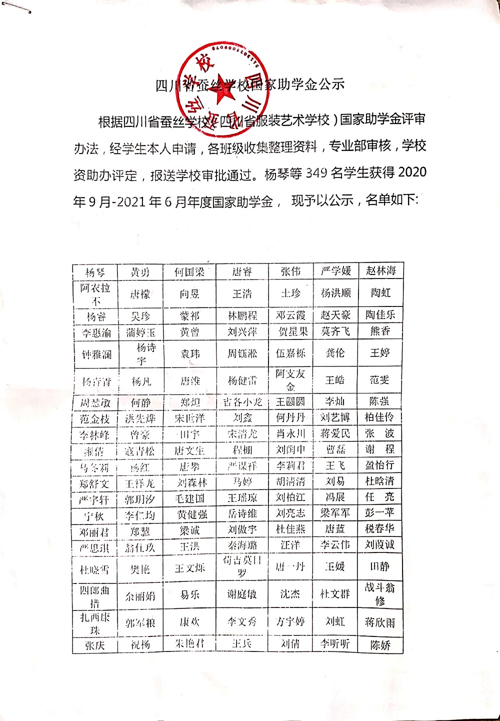 四川省蚕丝学校国家助学金公示