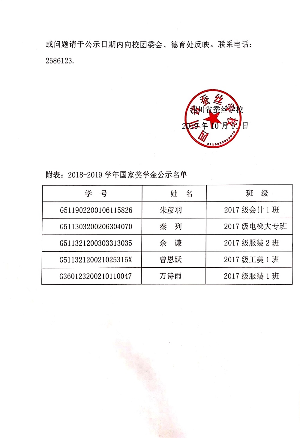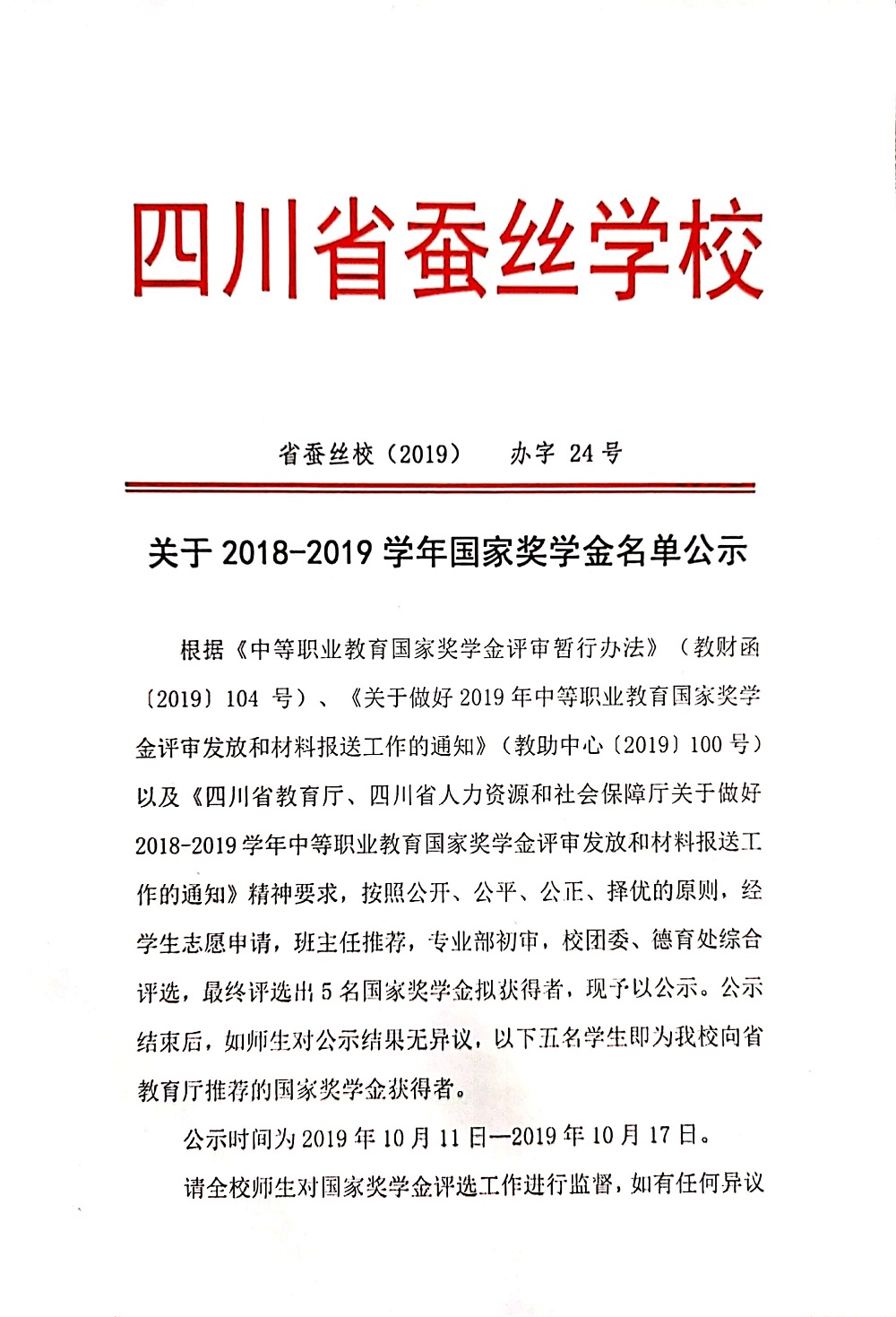 关于2018-2019学年中等职业教育国家奖学金的名单公示