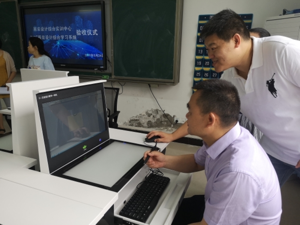 该项目于2019年2月完成招标后,在3,4月与深圳远湖科技有限公司完成了实训中心设计方案的讨论及“AR”课件资源交互虚拟仿真教学系统的定制。该实训中心于2019年5月6至5月9日完成教室的装修及E+互动设计教学一体机的安装。2019年5月10日上午安排了专业技术人员,对服装部专业教师进行了教学一体机的使用培训。该项目于2019年5月24日进行了验收。