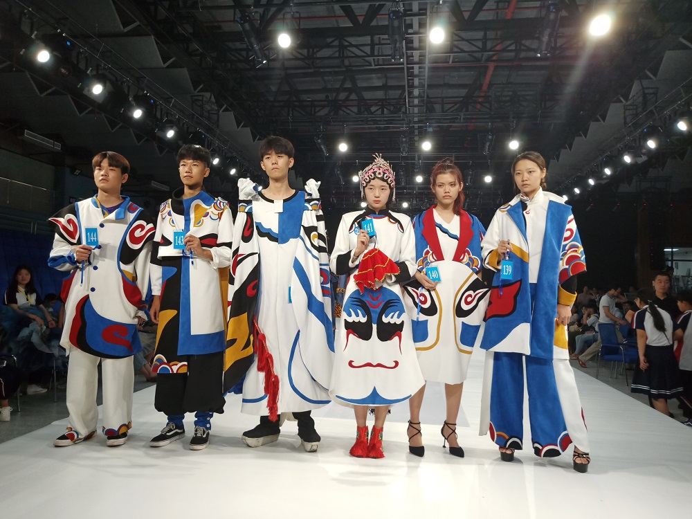 本次发布会组委会评委在海选阶段主要看中选手的设计能力和首套服装的成衣效果与效果图是否有差异。我们的学生作品设计主题《蜀国遗梦》与发布会丝丝入扣,鲜明的表达出了四川的地域特色,服装制作精良,故顺利通过海选并成功入围。整个系列服装的灵感来源于国家级非物质文化遗产川剧剧目《钟馗嫁妹》中人物钟馗脸谱形象,通过川剧脸谱图案造型的变形和图案设计,结合现代时装造型艺术,将非物质文化遗产用服装作为载体的形式呈现出来。在服装造型上参照了《钟馗嫁妹》中各个人物形象的服装外部轮廓,以大廓型为主,色彩则采用了钟馗脸谱上出现的红黄蓝黑、白色这五种色彩,面料选用了350g克重的麂皮绒,呈现出川剧大廓型服装的感觉。整个系列共有2男4女6套服装,共12件服装。