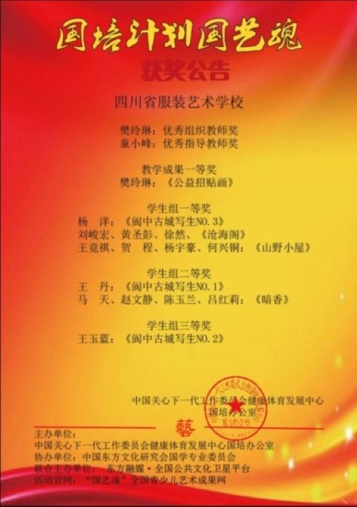 在我校工艺美术部师生的共同努力下,“雏鹰杯”全国书画大赛获得金奖20个,银奖12个,铜奖4个。7位老师荣获“全国优秀书画教师”称号。“国培计划国艺魂”艺术展演活动学生组获得一等奖9个,二等奖8个,三等奖2个。教师组获得一等奖6个,二等奖1个。具体获奖名单如下: