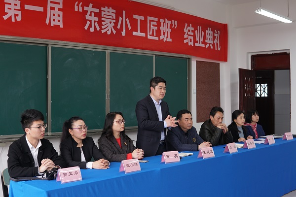 东蒙集团有限公司总裁助理王建友、人资助理翁笑添,我校副校长冯锐、教务处主任黄英、升学就业办主任赵春荣、服装部专业课教师及小工匠班全体学员参加了结业典礼。